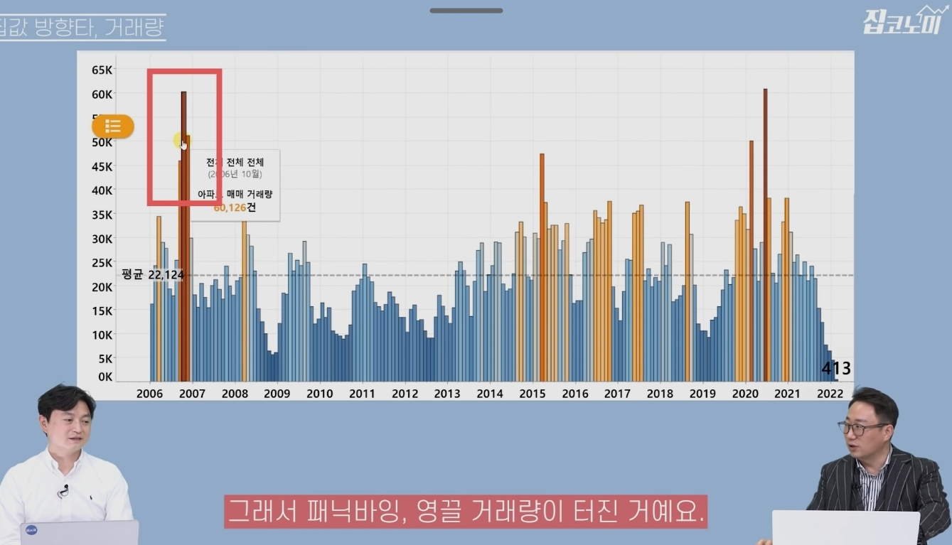 수도권 집값은 입주물량보다는 "거래량" 데이터를 보는 것이 매우 중요합니다. 모든 투자의 경우 나보다 비싸게 사 줄 사람이 있는지 없는지가 중요합니다. 저점에서 터지는 거래량은 상승의 신호로 고점에서 터지는 거래량은 끝물로 해석될 수 있습니다. 대중들의 패닉 바잉이 이뤄지고 나면 1년 반에서 2년 후 변곡점이 발생하게 됩니다. 패닉 바잉 이후에는 비싸진 가격에 더 이상 살 사람이 생기기가 어렵습니다. 특히 이번에는 코로나로 인한 저금리로 인해 패닉바잉이 가능했으나 이후는 그렇게 하기가 어려워 향후 잠재적 구매자가 늘어날 거라 보기는 더욱 어려운 상황입니다.