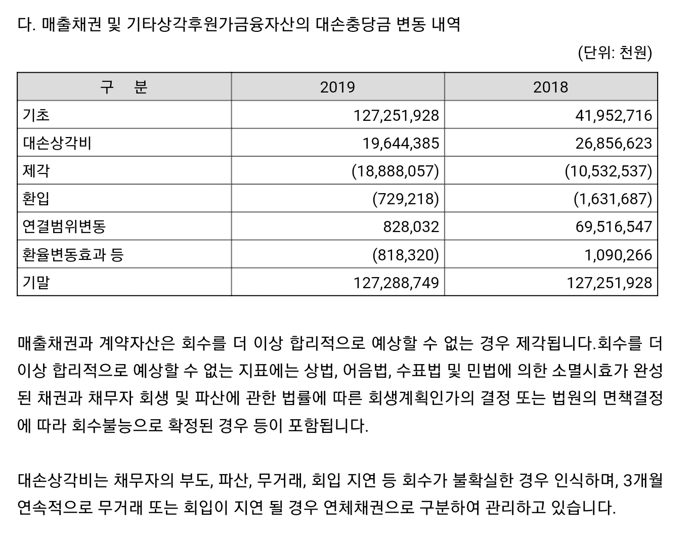 그리고 친절하게도 재무제표 주석사항에는 이런 대손충당금 변동내용을 자세히 보여주고 있습니다.