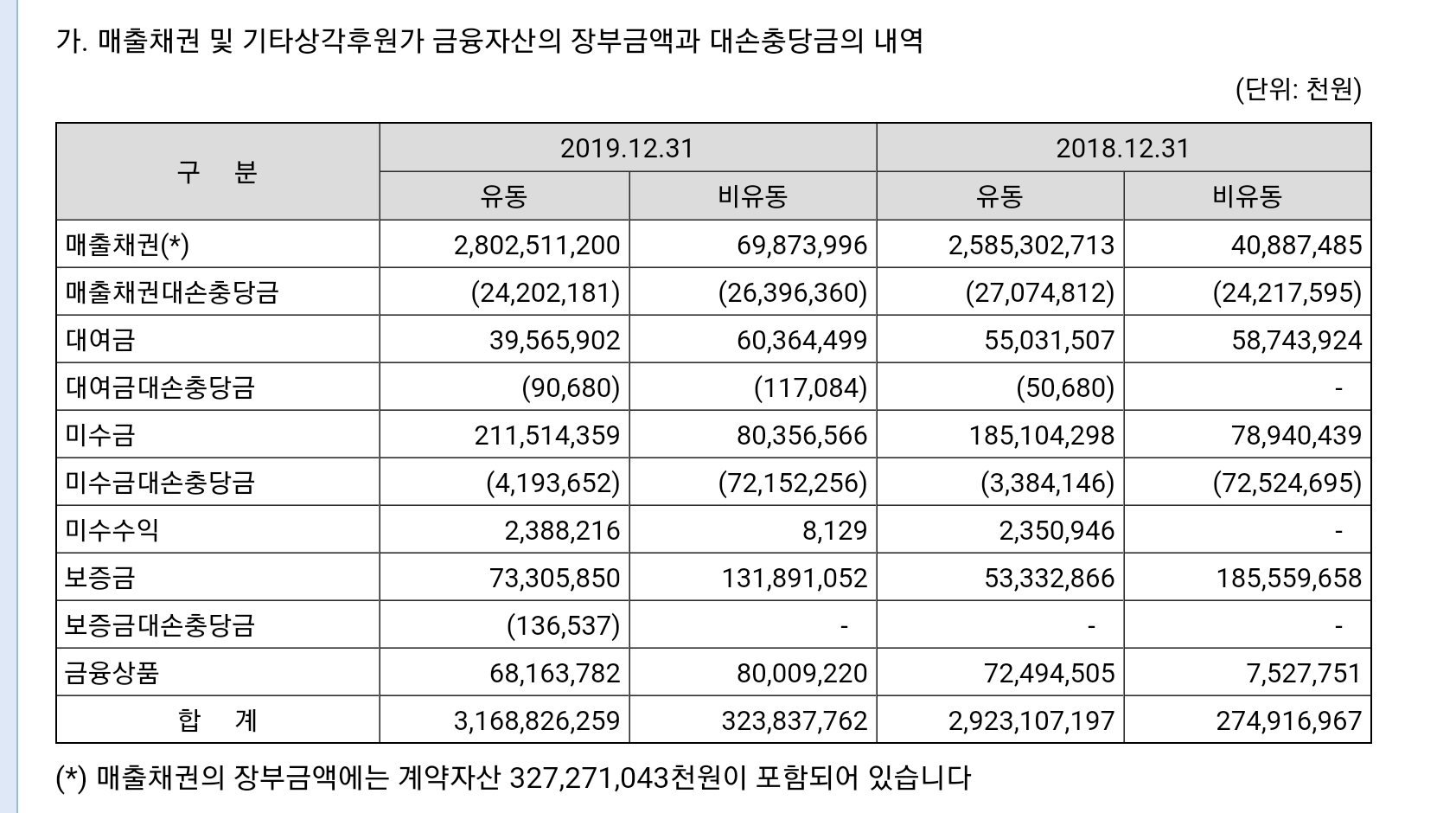주석에서 계약자산을 매출채권에 포함하여 대손충당금을 구분하였다고 부연하고 있습니다. 여기서 이 3,273억원의 계약자산은 재무상태표에서는 유동계약자산으로 별도로 표기되어 있던 금액입니다. 계약자산도 대손충당금을 쌓아야 하기에 매출채권에 포함하여 대손충당금을 표시하였습니다.