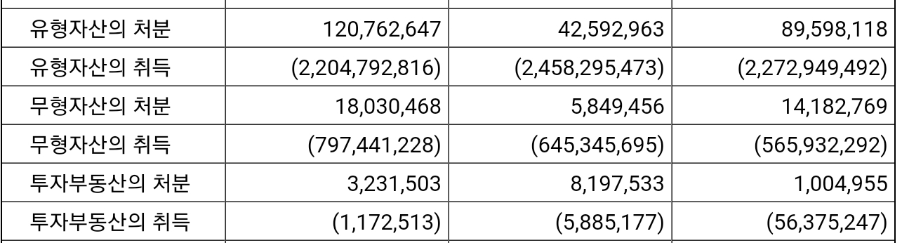 다만, 직전년도의 경우는 영업활동현금흐름이 1.5조이고 유무형자산취득은 3.0조로 부족했던 점이 있어서
