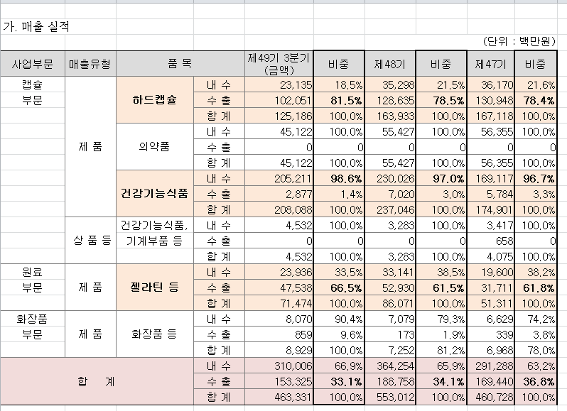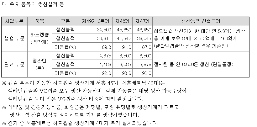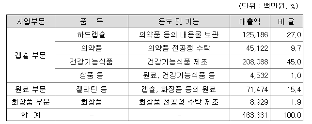 - 캡슐부문에는 건강기능식품 제조 (45%), 하드캡슐(27%), 의약품(9.7%)으로 구성