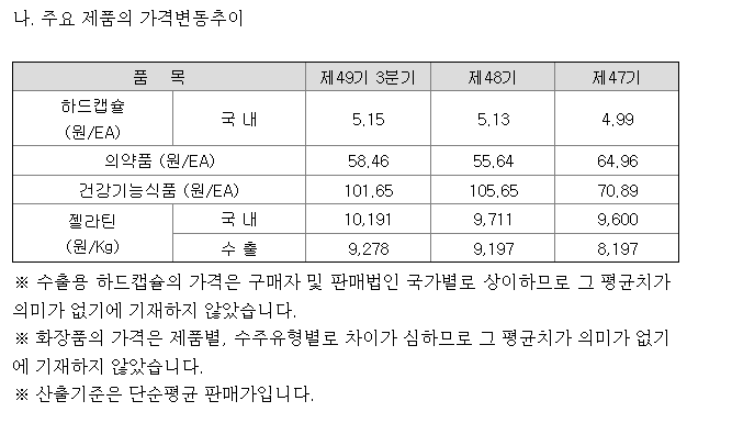 - 건강기능식품을 제외한 판매단가 소폭 상승 (하드캡슐 0.4%, 의약품 5.1%, 젤라틴 국내 4.9%, 해외 0.9%)하였으며, 원자개 가격은 국내 소폭 상승 (6.7%), 수입 소폭 하락 (-6.0%)하였음
