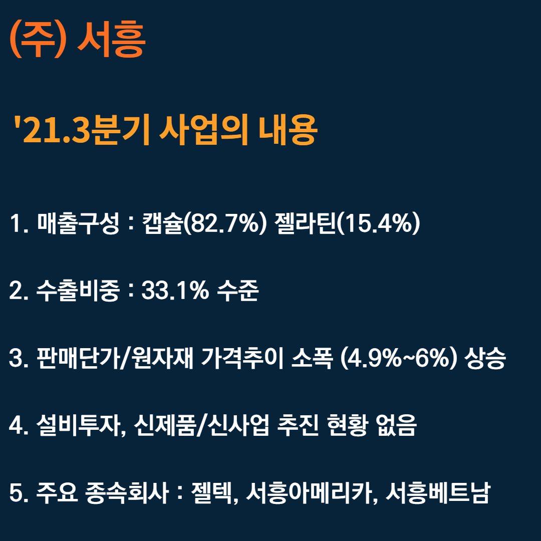 캡슐로 국내 독점적 지위를 확보하고 있는 (주)서흥의 사례로 분기보고서를 통해 회사의 사업을 파악해보도록 하겠습니다. 다만, 분기보고서에는 많은 내용이 담겨져 있기 때문에, 이 중 개인투자자 입장에서 알아야 할 내용*만 요점적으로 정리해보겠습니다.