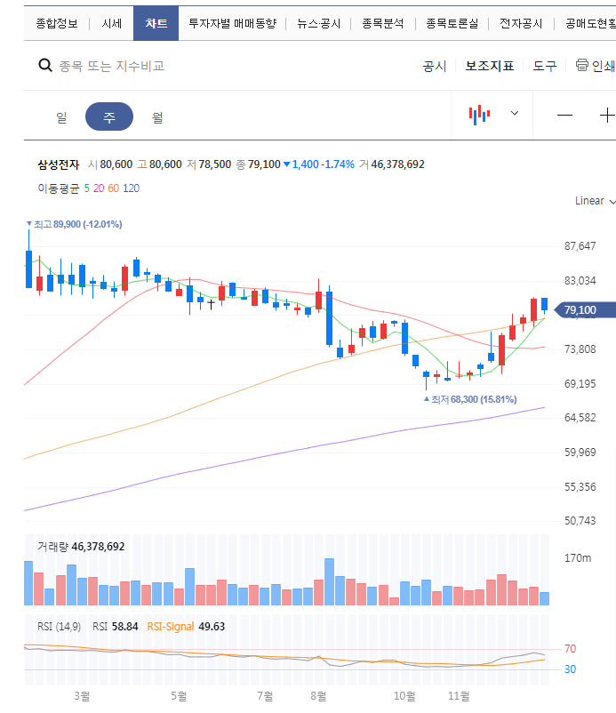 RSI는 보조지표로 증권사 트레이딩시스템에서도 확인할 수 있으나 사용의 편이성을 위해 네이버증권 차트에서 보조지표를 클릭하셔서 RSI를 추가하시면 아래와 같은 화면을 보실 수 있으실 것입니다. 예시로 삼성전자의 RSI를 조회해보았습니다.