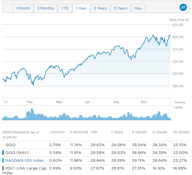 - QQQ의 지난 1년 수익률 차트를 살펴보면 아래와 같이 중간 중간 이벤트가 있을 때 변동성이 있었긴 하지만 꾸준히 상승을 지속하는 모양입니다. 최근 성장주 위주의 주식투자 선호 경향과 함께 QQQ의 수익률도 함께 성장한 모습입니다.