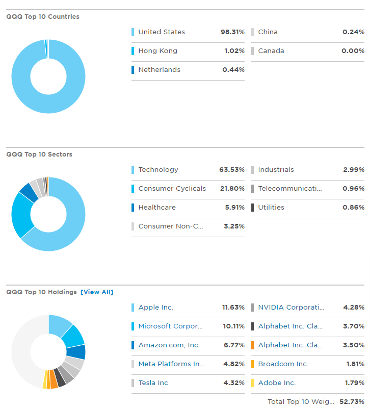 - QQQ의 국가별 비중은 역시 미국이 98.31%로 압도적이며 이 외에도 홍콩, 네덜란드, 중국의 비중이 포함되어 있으나 그 비중은 미미하다고 볼 수 있습니다.