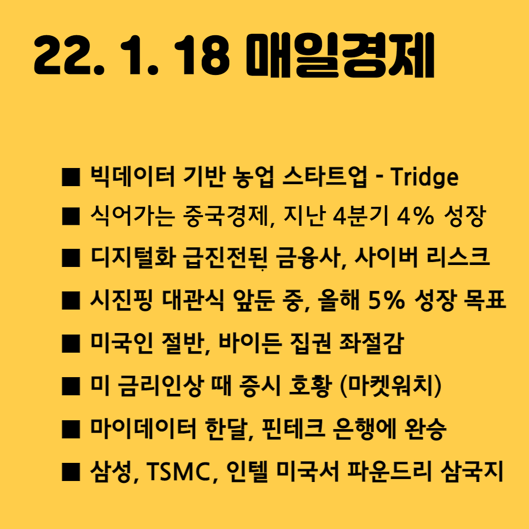 중국 경제 둔화로 인한 올해 세계 경제 성장은 기저효과를 감안해도 작년과 비교시 괄목할 만한 성장률은 기대하기 어려울 것으로 보인다. 미국의 국민 또한 이런 실망감이 설문조사로 반영된 것일 수도 있을 것 같다. 이런 가운데서도 분야별 혁신의 모습이 드러나고 있는 듯한다. 빅데이터를 기반으로 한 농업스타트업이라든지, 금융권에서는 마이데이터, 이로 인한 사이버 보안 강화 이슈, 반도체 분야의 삼파전 등 올해는 이러한 분야별 성장스토리를 집중에서 살펴볼 필요가 있을 것 같다.