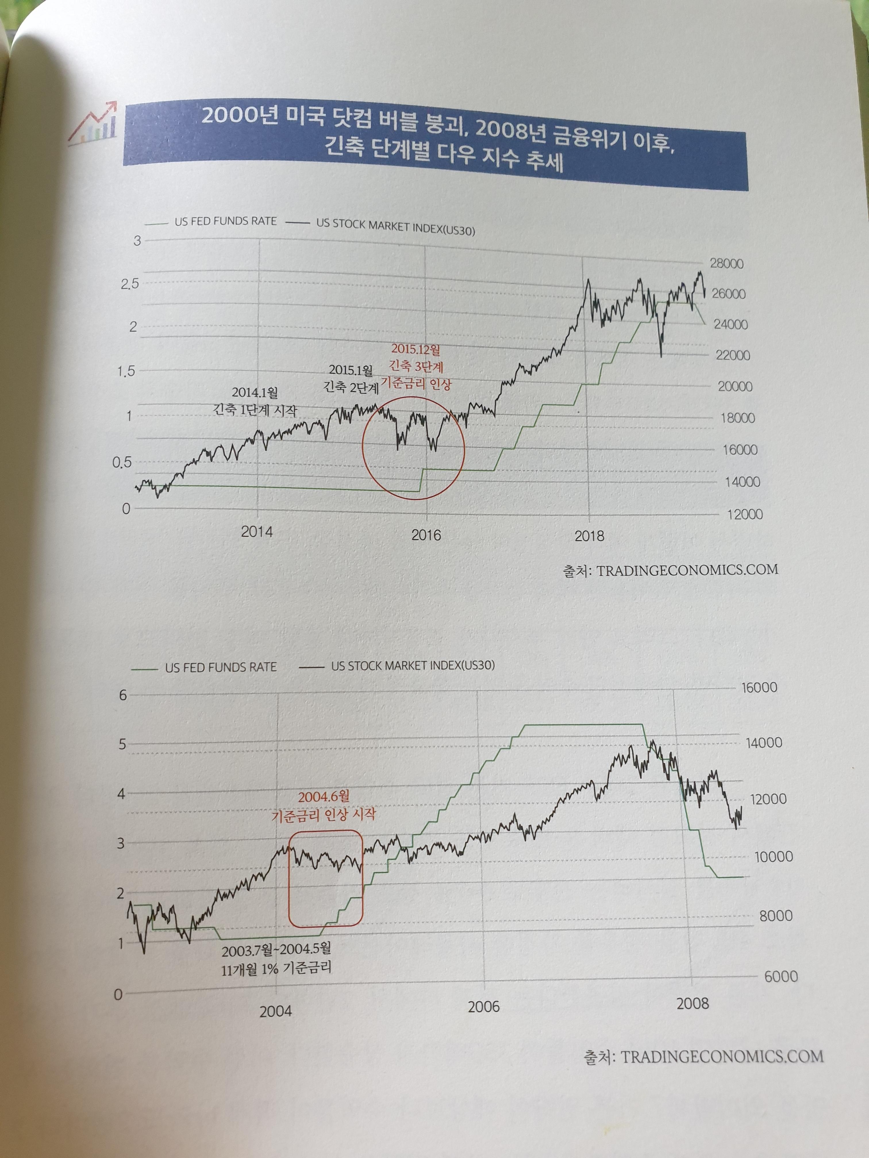 - 저자는 긴축 3단계를 역이용한 매매 전략을 제시하고 있습니다. 긴축 3단계 (기준금리 인상 시작)를 실시하는 전후로 6~7% 정도 기술적 조정 발생시 투자자가 조정시마다 분할 매수 전략으로 대응한다면, 안정적인 수익을 얻을 수 있는 확률이 높아질 것이라고 이야기합니다.