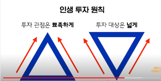 그는 유대인의 별모양을 통해 "인생투자 원칙"을 이야기 합니다. 별을 두가지 세모로 분리하여 투자관점은 뾰쪽하게 즉, 심플하게 "미래, 변화, 사람"을 보고 투자하는 관점을 세웠다고 합니다. 반면에 투자 스펙트럼 넓게 보아야 한다고 이야기합니다. 주식 외에도 부동산 비상장주식 실물자산 펀드 크립토 미술품 등으로 넓게 볼 수 있어야 한다고 합니다.